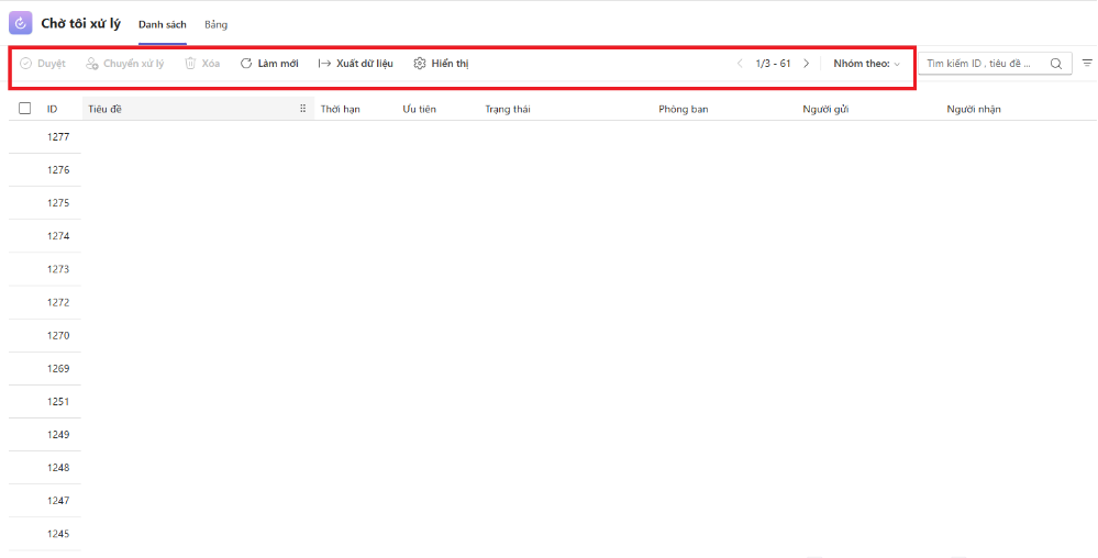 * Nhóm theo: Nhóm các yêu cầu theo Quy trình hoặc Người gửi hoặc Xóa nhóm để sắp xếp theo thứ tự từ mới nhất đến cũ nhất.&#x20;