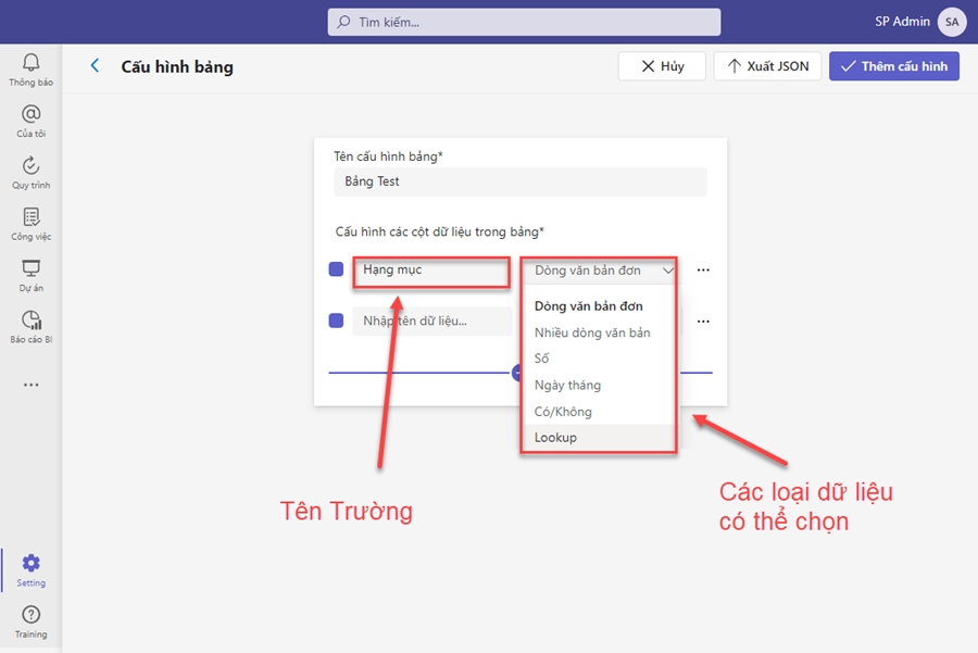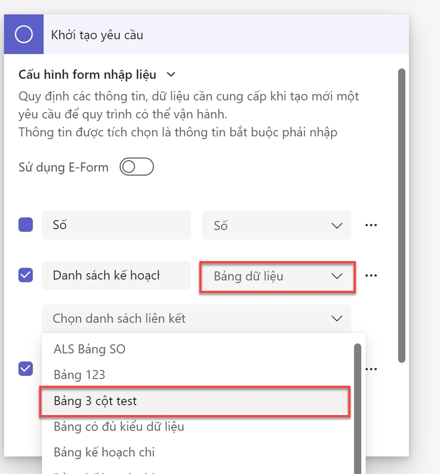 SP365 cho phép tạo các trường dữ liệu dạng bảng. Để chọn được bảng khi cấu hình quy trình, quản trị viên cần cấu hình bảng dữ liệu trước khi cấu hình quy trình.