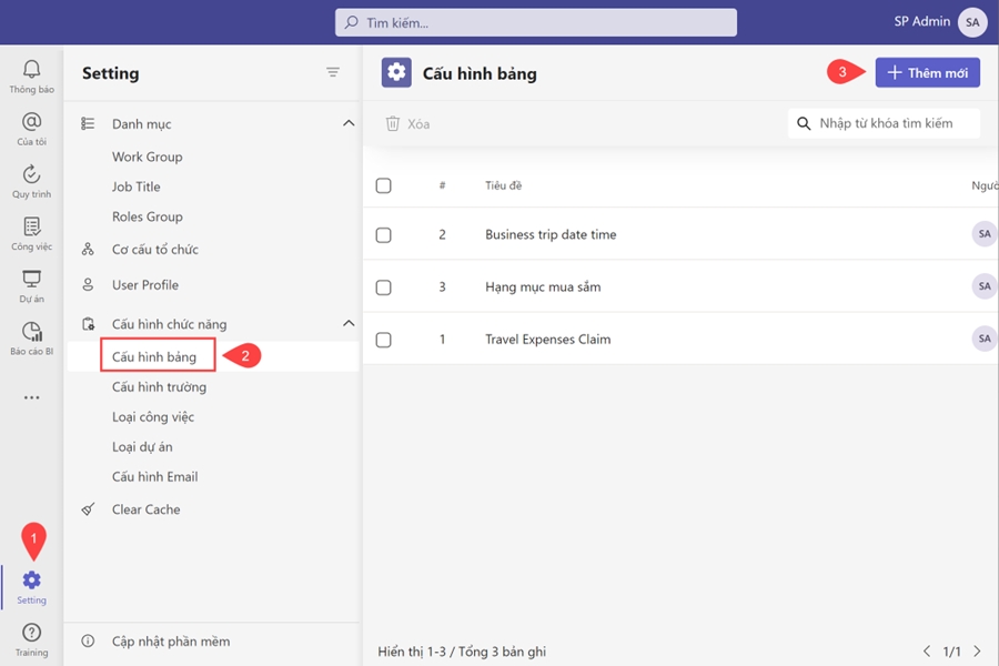 Bước 1: Chọn <Setting>, từ menu chọn <Cấu hình bảng>, chọn <Thêm mới>