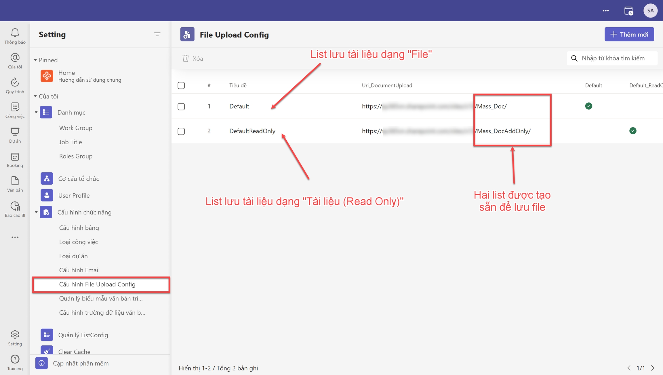 Khi sử dụng phần mềm, bên cạnh việc đính kèm tài liệu lên quy trình bằng cách gắn link SharePoint Online, sẽ có nhiều trường hợp người dùng cần đính kèm từ file lưu trong máy tính cá nhân. Để giúp cho việc quản lý các tài liệu được upload lên hệ thống, khi kích hoạt phần mềm SP365, hệ thống sẽ tạo sẵn 02 list để lưu các tài liệu được upload lên từ máy tính cá nhân với 2 mục đích khác nhau.