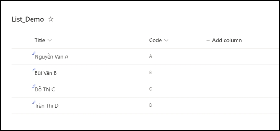 Lưu ý: tất cả các list bắt buộc cần có cột tên “Title” và “Code”