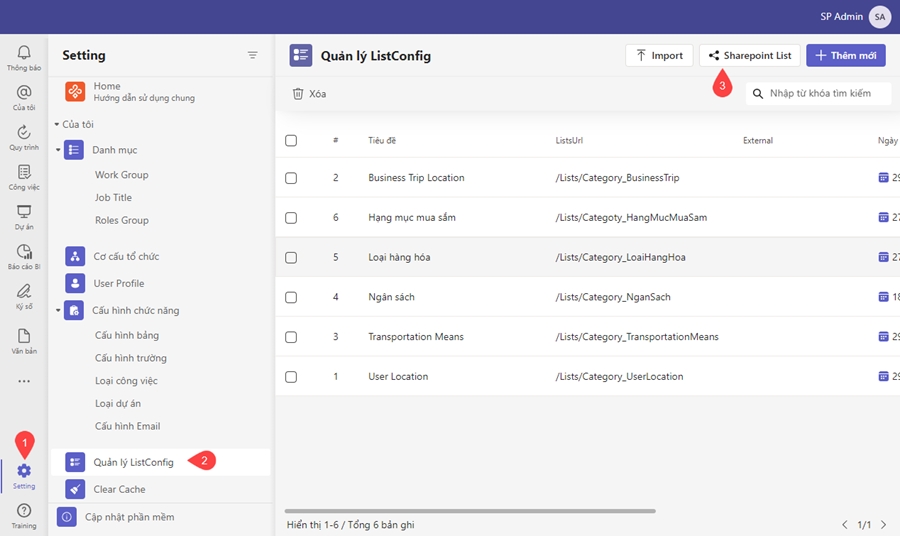 Bước 1: Từ màn hình chính chọn <Setting> => chọn <Quản lý ListConfig> và chọn <SharePoint List>