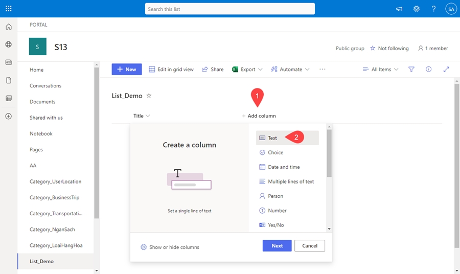 Bước 5: Sau khi đã tạo được list, chọn <Add Column> để thêm cột, chọn dạng dữ liệu <Text>