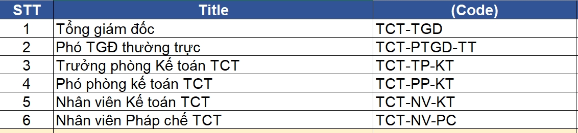b. Code: Mã chức danh (viết liền không dấu) – Lưu ý mã chức danh là giá trị duy nhất