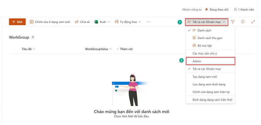 Bước 3: Từ màn hình của list WorkGroup, chọn <+ Mới> để thêm từng WorkGroup hoặc Chỉnh sửa ở dạng xem lưới để thêm nhiều WorkGroup một lúc