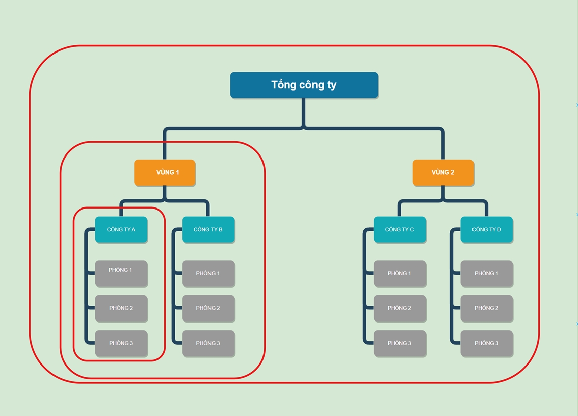 Minh họa cách chia WorkGroup cho một Tổ chức được chia làm nhiều cấp.