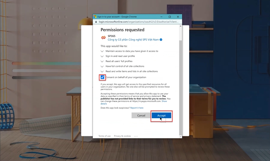 Bước 5: Chọn “Consent on behalf of your organization” và “Accept”