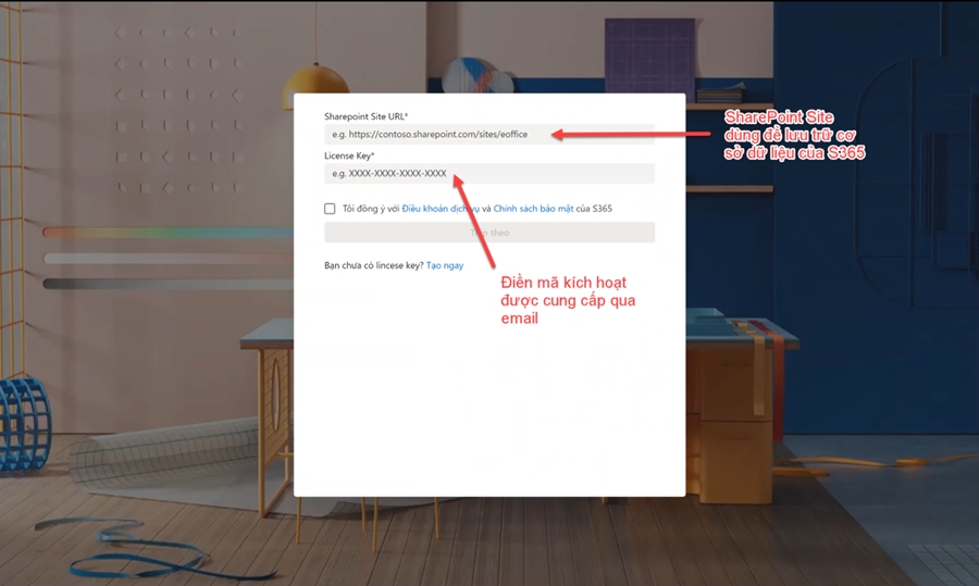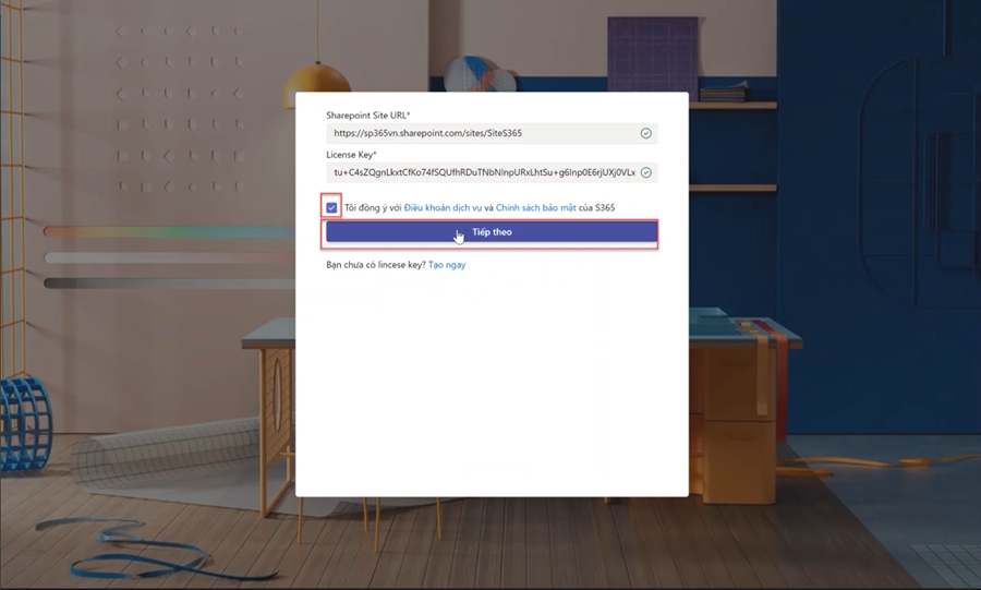 Bước 3: Sau khi thêm SharePoint site và License Key, chọn “Tôi đồng ý với Điều khoản dịch vụ và Chính sách bảo mật của SP365” và chọn “Đồng ý”