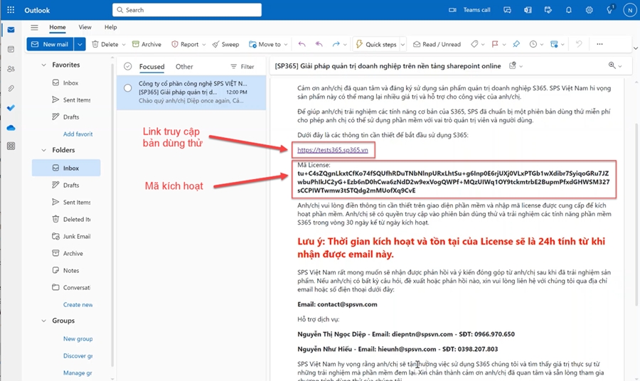 Với các khách hàng đăng ký dùng thử qua Form, sau khi kiểm tra, hệ thống sẽ gửi về một email với các thông tin kích hoạt bản dùng thử SP365.