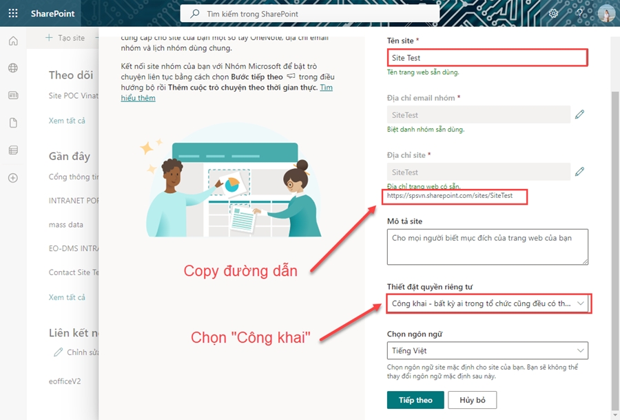 Bước 5: Điền tên site, thiết đặt quyền riêng tư (chọn nhóm Công khai) và ngôn ngữ. Ấn Tiếp tục => Hoàn tất. (không cần thêm thành viên)