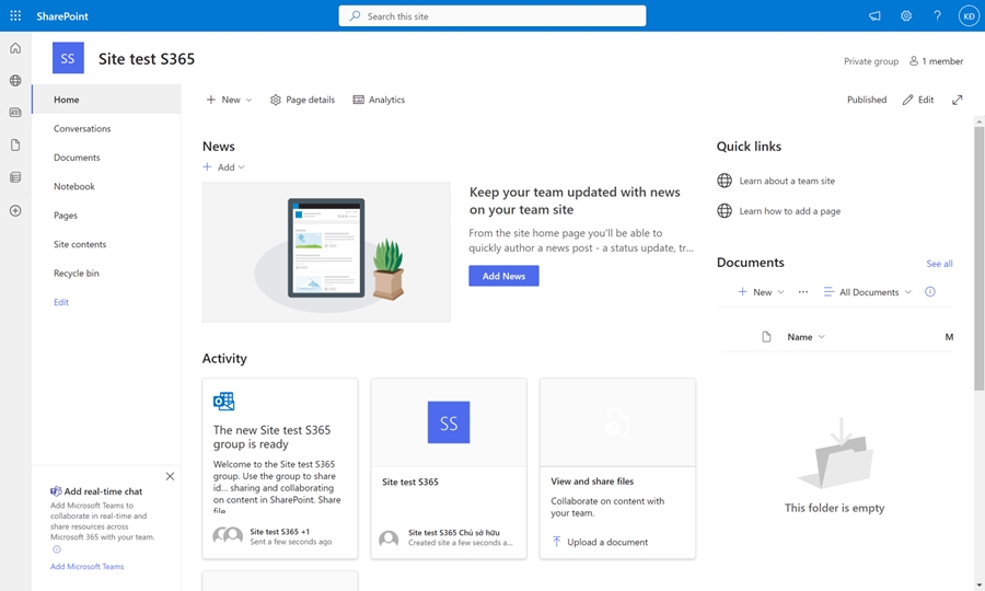 Hướng dẫn tạo một SharePoint site mới quản trị CSDL cho SP365.