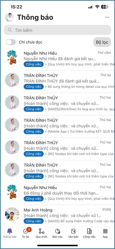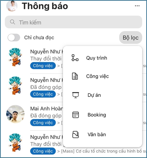 - Hiển thị các thông báo có liên quan tới người dùng để trách bỏ lỡ công việc, nhắc nhở, thảo luận, thay đổi sẽ đều ghi nhận và thông báo tới người dùng