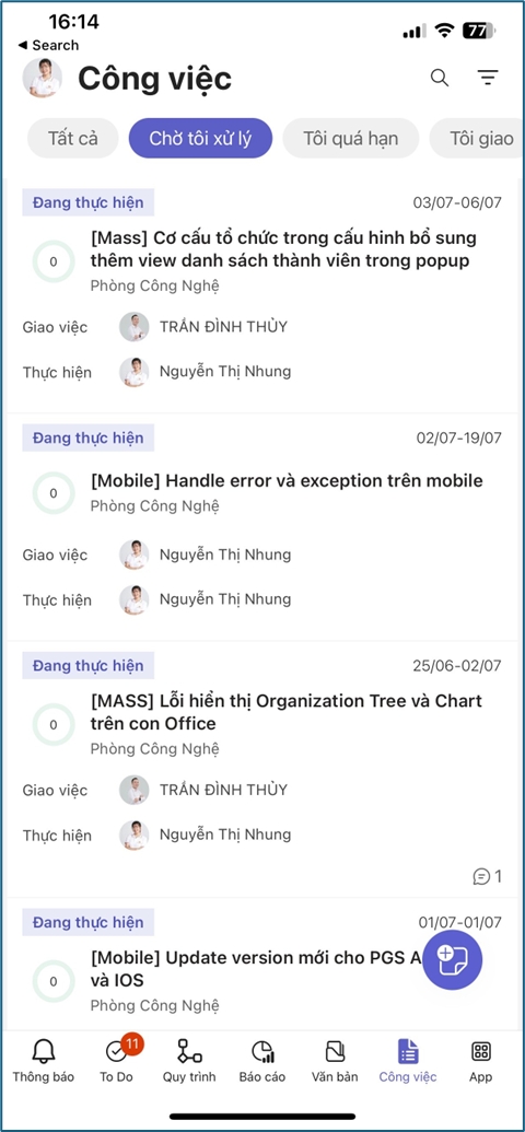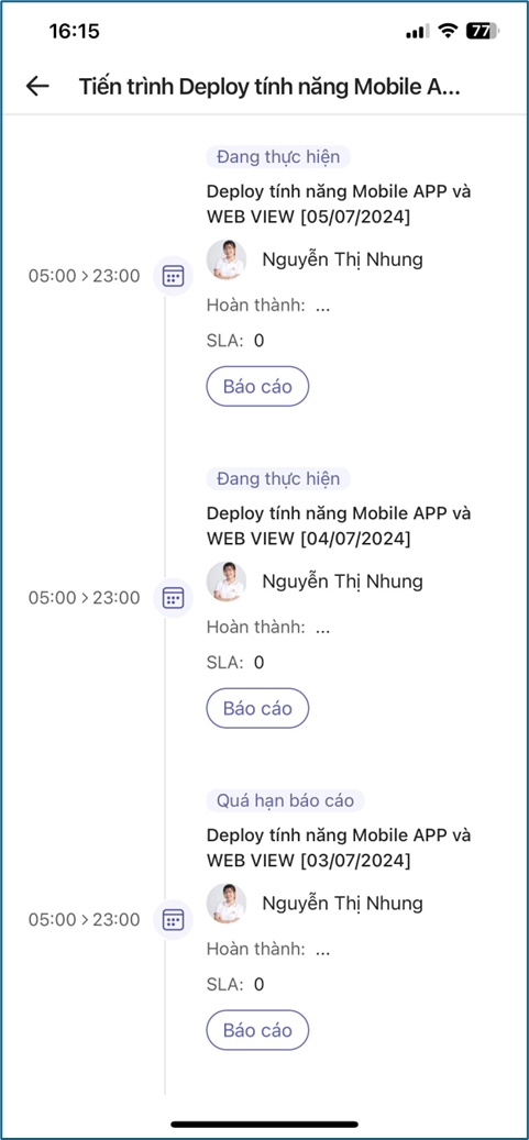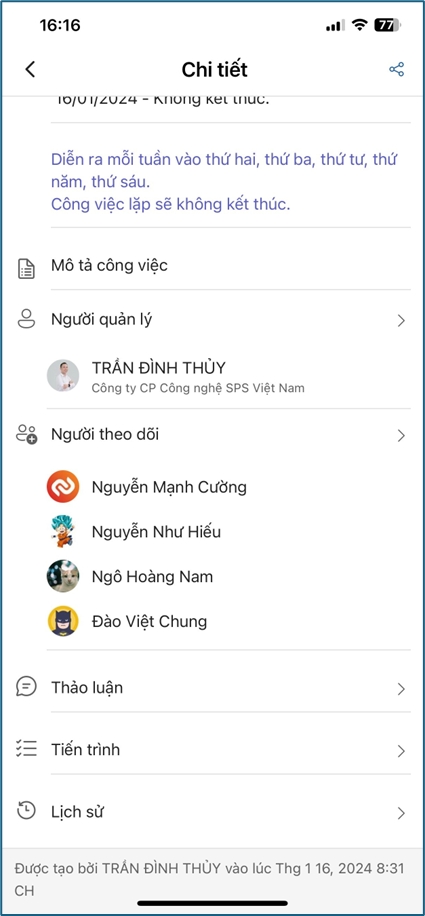 - Người dùng chọn Chữ “Tiến trình” tại màn hình chi tiết công việc