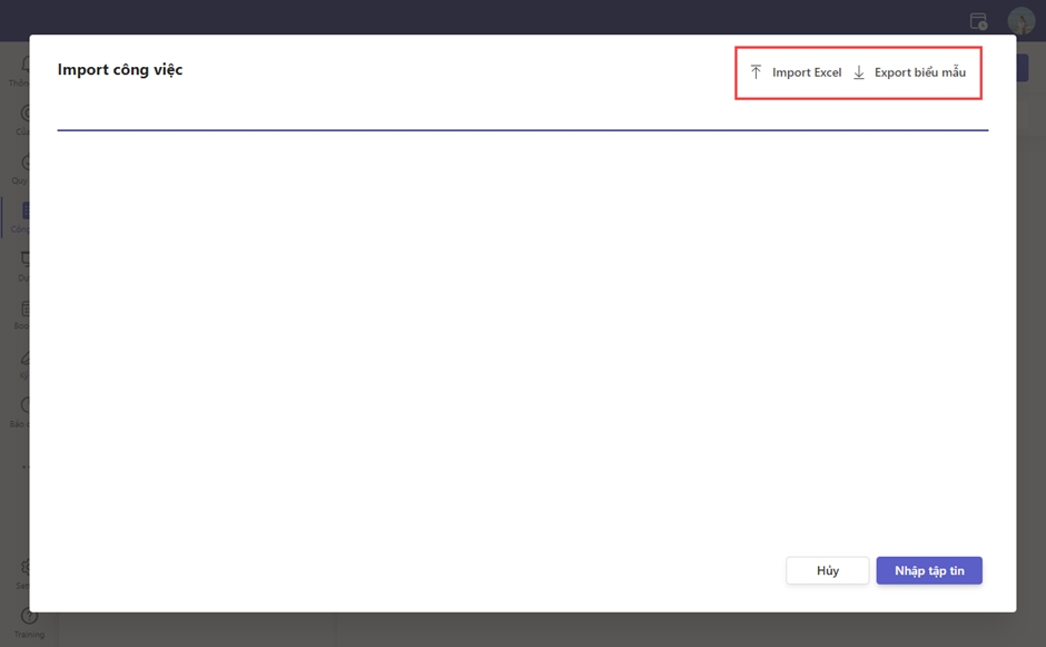 Bước 1: Từ màn hình chính của Module Công việc, chọn <Import>, chọn loại công việc nếu cần.