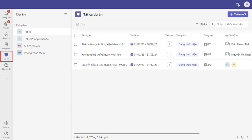 - Bên phải là danh sách dự án theo phòng ban mà người dùng có thể xem được