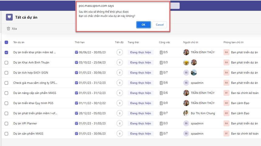 Nhấn <Xóa>, hệ thống hiển thị cảnh báo về việc không thể khôi phục thông tin dự án sau khi xóa