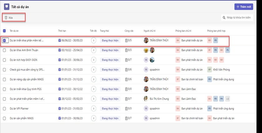 Từ danh sách dự án, tích chọn các dự án cần xóa