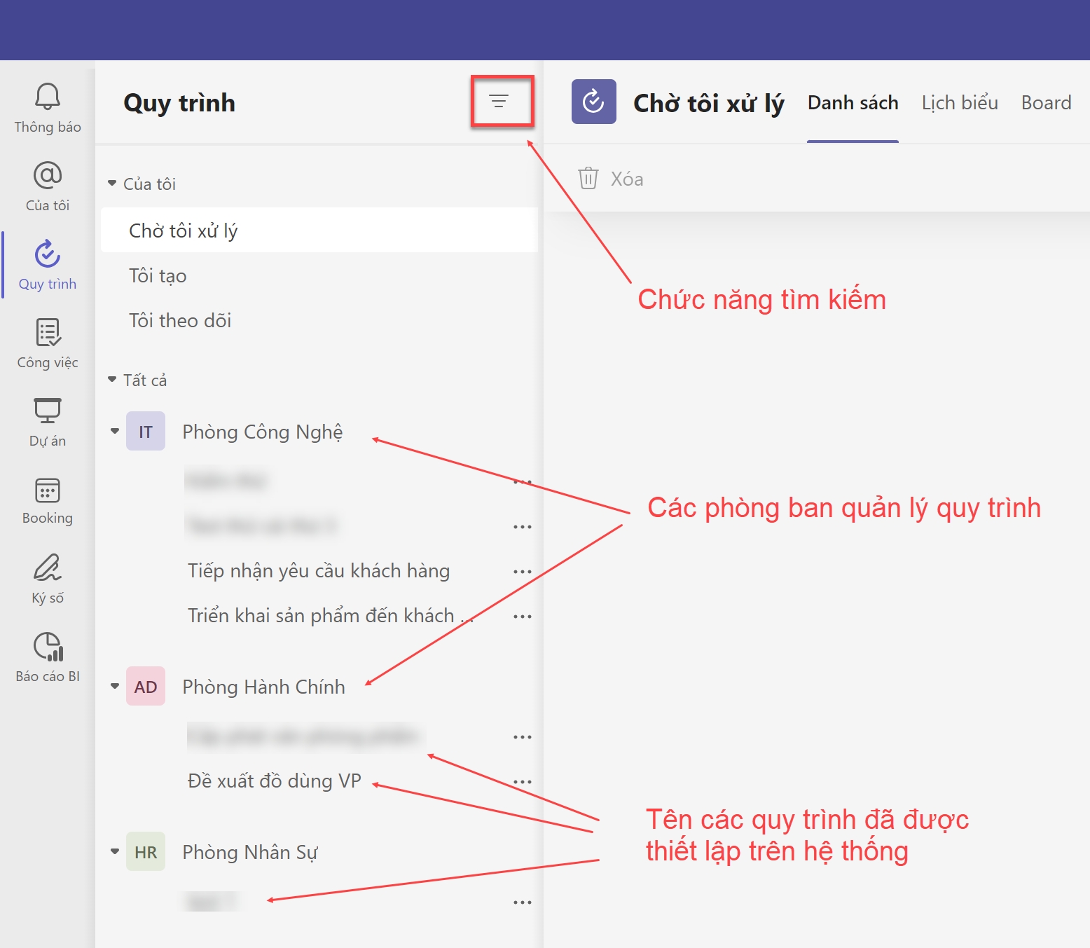 d. Danh sách quy trình theo phòng ban: Các quy trình được phân loại theo phòng ban quản lý. Danh sách quy trình được phân quyền theo vai trò phê duyệt, do đó mỗi người dùng có thể nhìn thấy số lượng quy trình khác nhau.