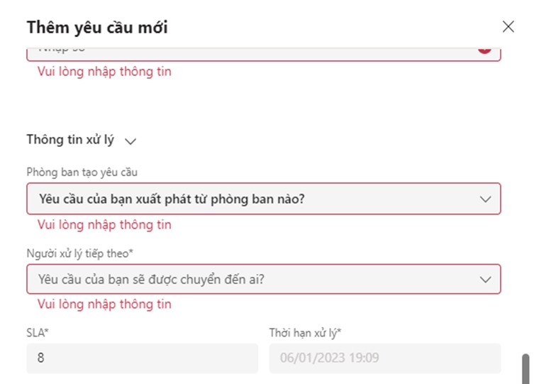 Lưu ý: Nếu người dùng chỉ thuộc 1 phòng ban, trường “Phòng ban tạo yêu cầu” sẽ không hiển thị.