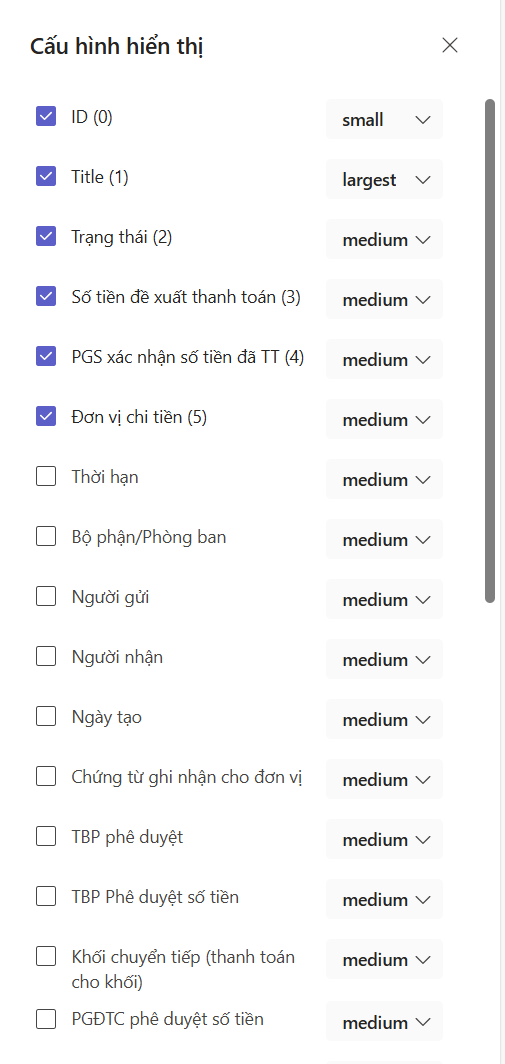 VD như phòng kế toán cần nhìn số tiền đề xuất được phê duyệt của lãnh đạo thì thiết lập như sau: