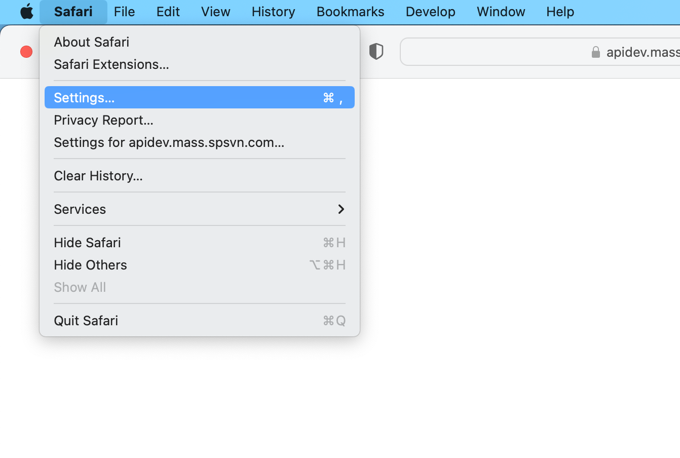 Trước tiên, hãy mở ứng dụng trình duyệt Safari trên máy Mac và điều hướng đến đường dẫn tới phần mềm SP365 của đơn vị. Trong thanh menu ở cạnh trên của màn hình, bạn nhấp vào tab “Safari”. Từ menu thả xuống, bạn bấm chọn mục “Setting”, như hình minh họa dưới đây.