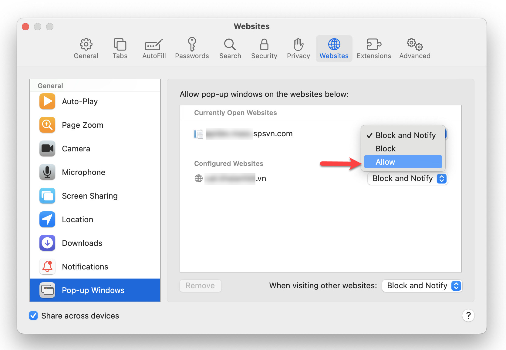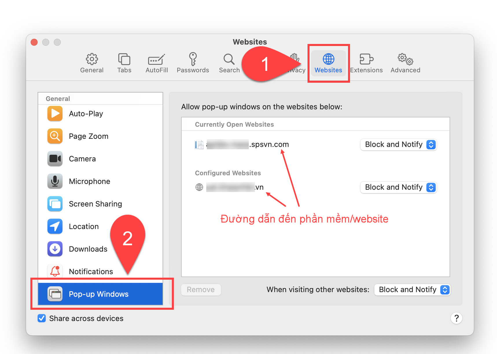 Trong cửa sổ Setting, bạn nhấp vào tab “Websites”, sau đó cuộn xuống cuối menu bên phải màn hình và bấm vào mục “Pop-up Windows”.