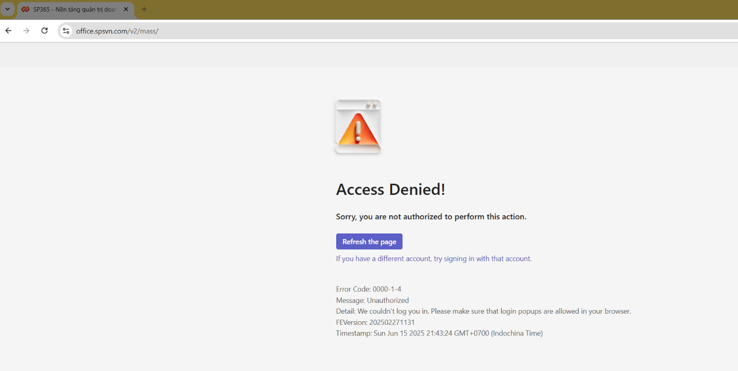 Màn hình popup đăng nhập bị trình duyệt chặn (lý do bảo vệ người dùng,...) dẫn đến không thể đăng nhập tài khoản Microsoft. Từ đó không vào được SP365 và sử dụng.